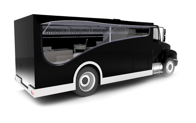 Concept: At “Blaks”, filling food, worthy of being served at the restaurant, can be cooked. The kitchen has everything that is necessary: various ovens, grills, deep-fat fryers, etc. “Blaks” provides freezers for fresh fruit and vegetables, meat and other products. In addition, there is a fire-control unit, a kitchen extractor fan, a toilet, several washstands, and a big water tank provided. The mobile kitchen can get electricity from sun batteries, located on the roof. The mobile kitchen is designed in stylish black that matches, in general, the company name.