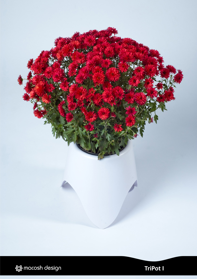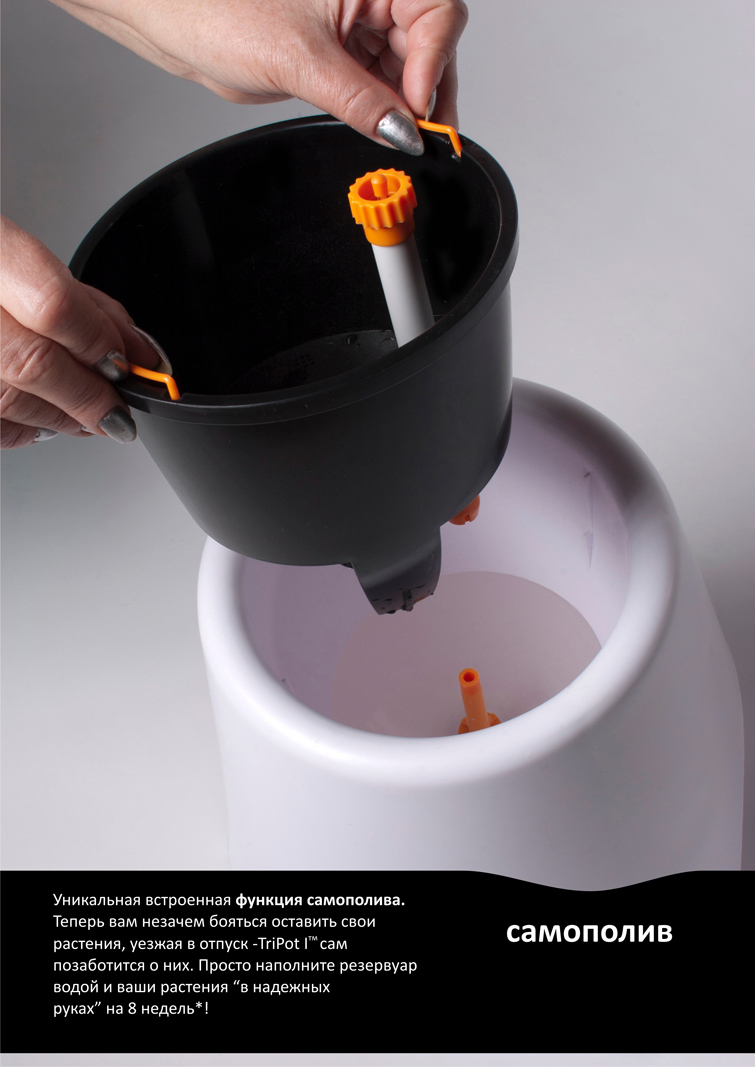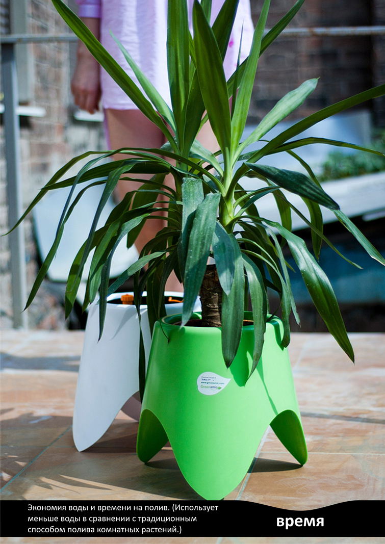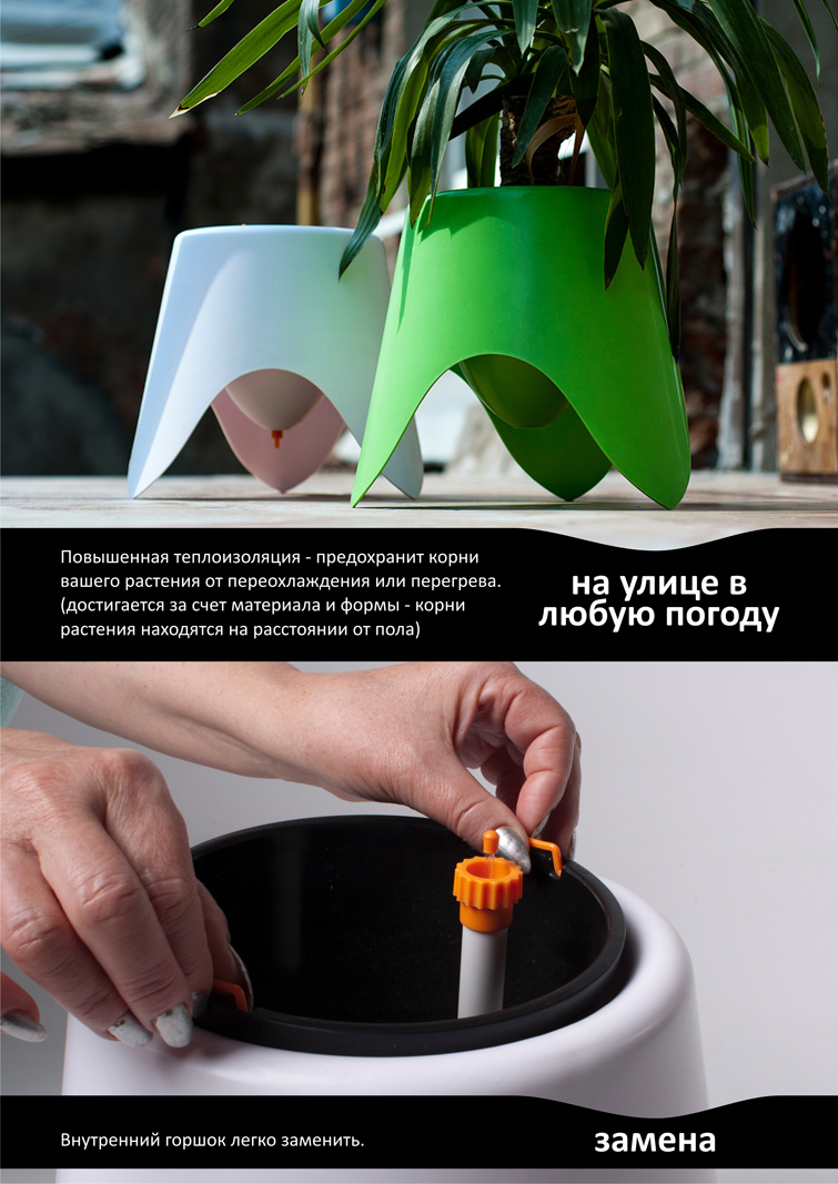 Conception: A flowerpot is an extension of a plant – its form is smooth, bionic. Besides an original design, the flowerpot uses a unique watering system. Thanks to a construction of two pots and a float, a user will always know the moisture level in the pot; water excess is stored in a special tank of the outer pot, thereby the soil evenly absorbs moisture. This means that the user can “forget” about the plant for eight days – this is, approximately, the period the soil requires to fully absorb moisture.