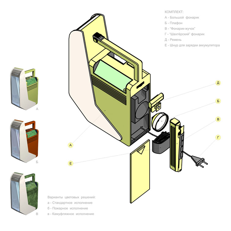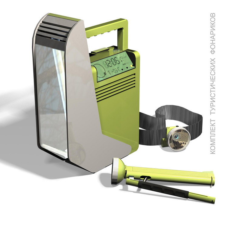 Conception: A big lamp with a fitted accumulator is supplied with additional devices: a clock, a thermometer, a barometer, a radio, and a compass. The information is shown on two displays. However, the main function is lighting. The plafond separates lightning on 3 levels of brightness: straight – due the direction of lamp, oblique – the light comes underfoot, and diffused – softly lighting the space around the lamp.