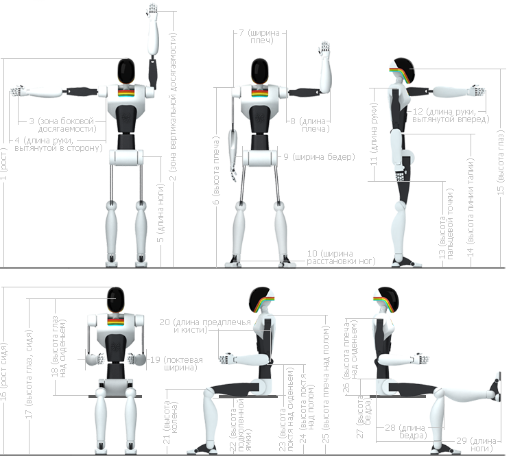 23 | высота локтя над сиденьем | 21 | 25.4 | 29.7 | 19.2 | 23.2 | 27.1 |