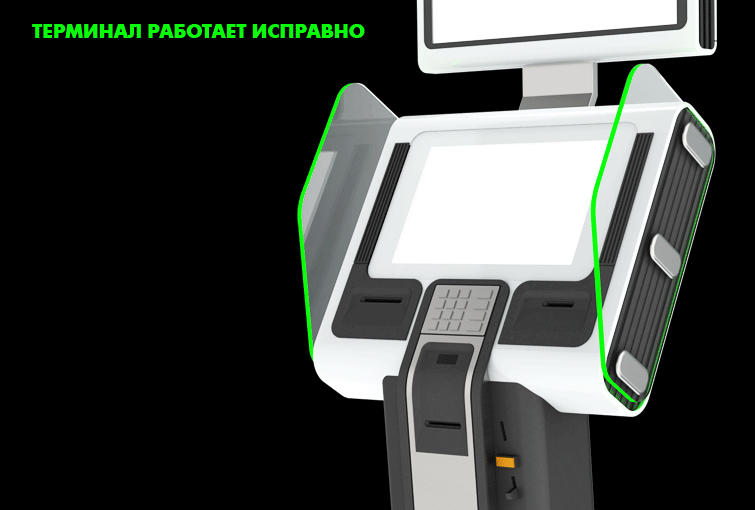 - Показывает состояние терминала. Если контуры шторок светятся зеленым цветом, то это значит что терминал полностью в рабочем состоянии. Оранжевый цвет указывает на то, что с терминалом работает технический персонал (т.е. вы не спутаете человека из тех. обслуживания с обычным пользователем и будете знать – что данная операция может занять длительное время) Красный цвет указывает на временное нерабочее состояние. (например, отсутствие интернет-связи). Обо всем этом вы сможете увидеть издалека, даже не подходя к терминалу.