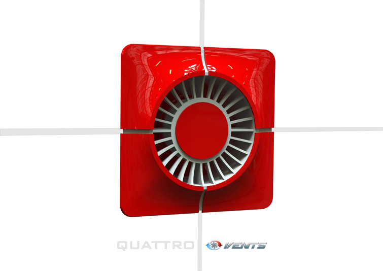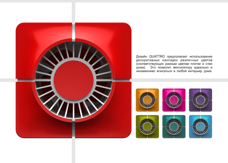 Концепция: Дизайн QUATTRO предполагает использование декоративных накладок различных цветов (соответствующих разным цветам плитки и стен дома). Это позволит вентилятору идеально и ненавязчиво вписаться в любой интерьер дома.