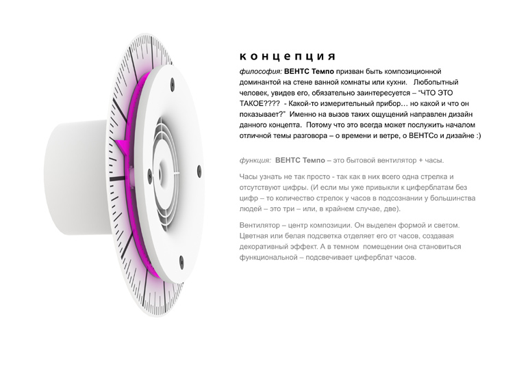 философия:ВЕНТС Темпо призван быть композиционной доминантой на стене ванной комнаты или кухни. Любопытный человек, увидев его, обязательно заинтересуется – “ЧТО ЭТО ТАКОЕ???? - Какой-то измерительный прибор… но какой и что он показывает?” Именно на вызов таких ощущений направлен дизайн данного концепта. Потому что это всегда может послужить началом отличной темы разговора – о времени и ветре, о ВЕНТСо и дизайне :)