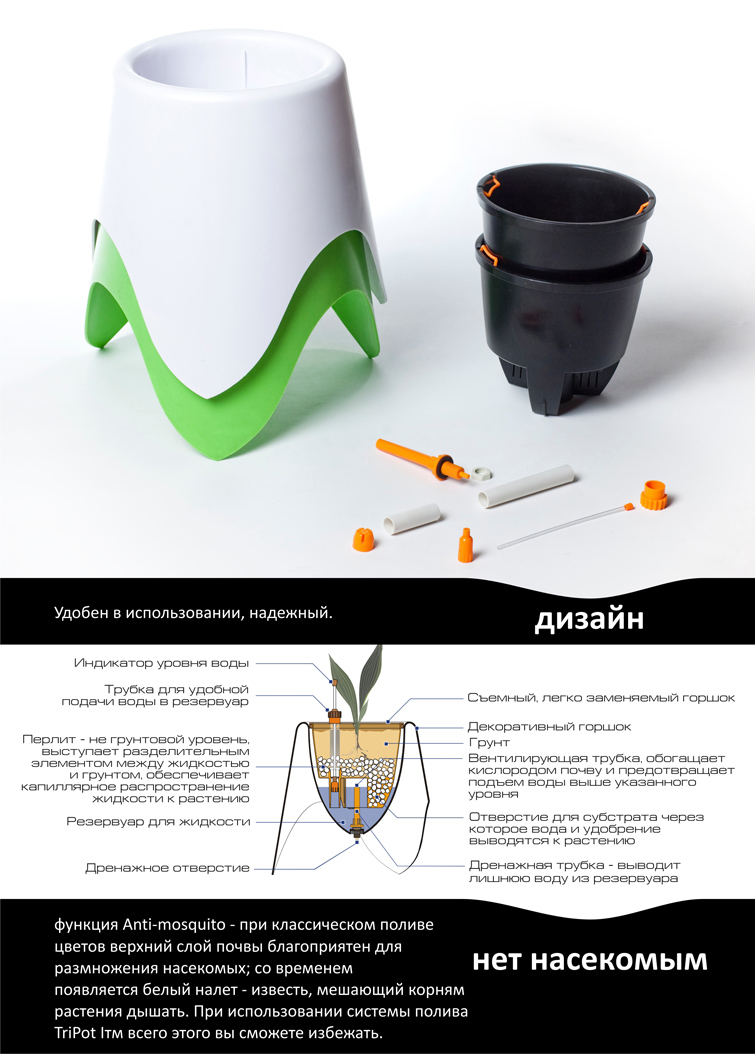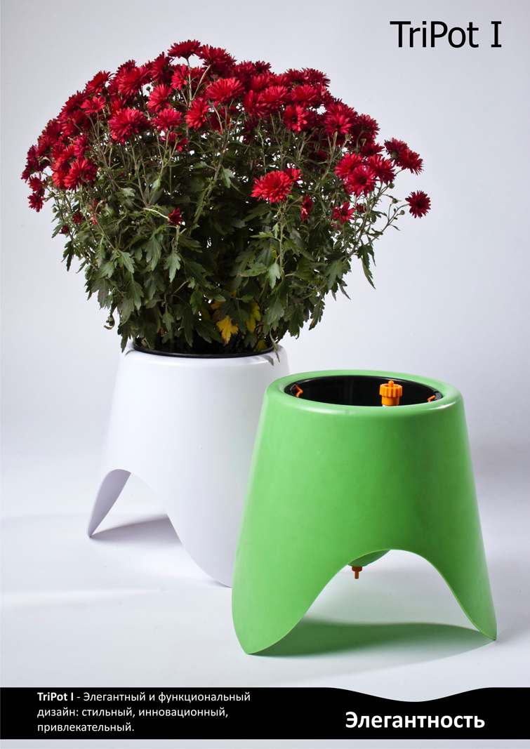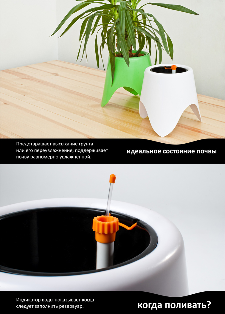Концепция: горшок для цветов является продолжением растения – его форма плавная, бионическая. Помимо оригинального дизайна горшок использует уникальную систему орошения. Благодаря констркукции из двух горшков и поплавка пользователь всегда будет осведомлен об уровне влаги в горшке; избыток воды хранится в специальном резервуаре внешнего горшка – таким образом влага поглощается почвой равномерно. Это значит, что пользователь может «забыть» о своем растении недель на 8 – примерно столько времени необходимо на полное поглощение воды почвой.