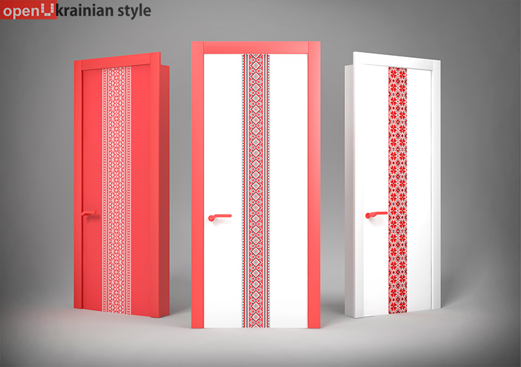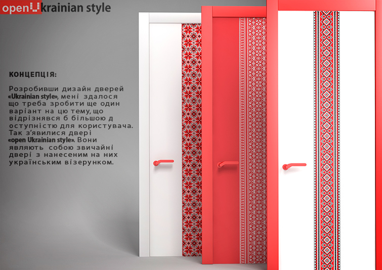 Концепция2: Разработав дизайн дверей «Ukrainian style», мне показалось, что надо сделать еще один вариант на эту тему, отличающийся большей доступностью для пользователя. Так появились двери «open Ukrainian style». Они представляют собой обычные двери с нанесенным на них украинским узором.