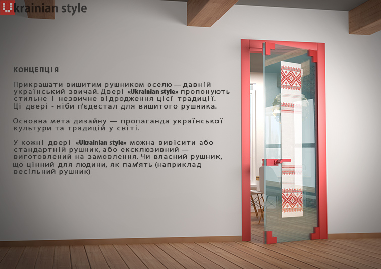Концепция: Украшать вышитым полотенцем дом - давний украинский обычай. Двери «Ukrainian style» предлагают стильное и необычное возрождение этой традиции. Эти двери - как пьедестал для вышитого рушника.