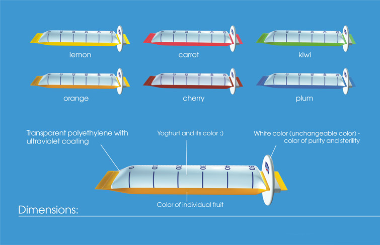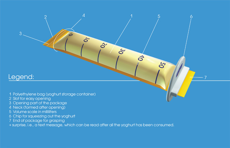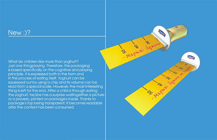 Концепция: Что любят дети больше йогурта? Только одно - играть. Именно познавательно-игровой принцип и лег в основу данной упаковки. Он выражен как в форме, так и в самом процессе еды. Содержимое йогурта можно выдавить с помощью фишки, а его количество узнать по специальной шкале. Но самое интересное оставлено на последок. Когда ребёнок съест йогурт, его ждет сюрприз - картинка или пословица. Она напечатана на внутренней стороне упаковки и благодаря прозрачности верхней части упаковки, становиться читабельной после извлечения содержимого.