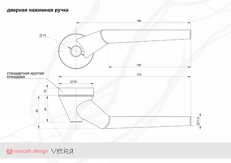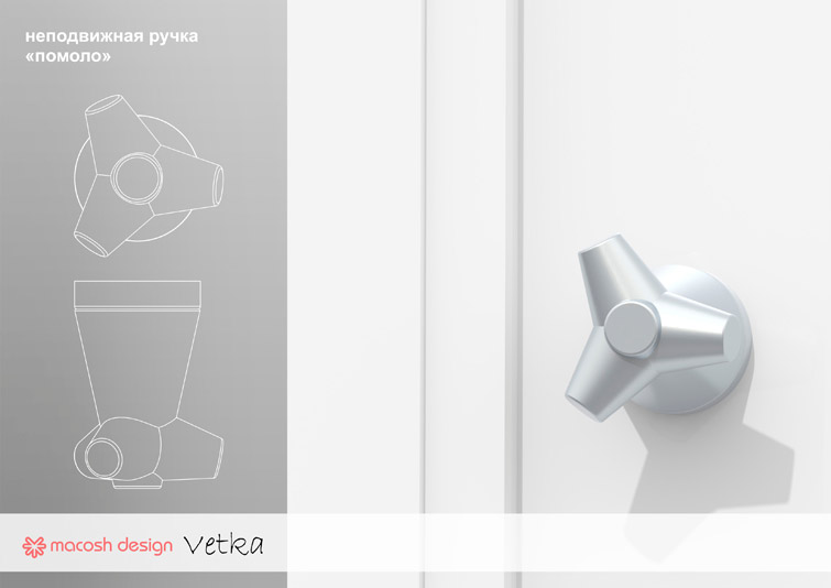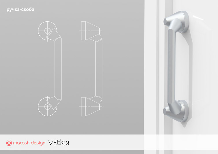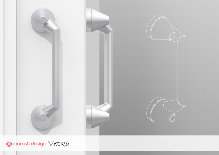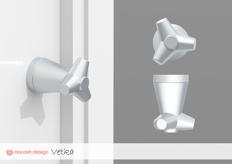 Концепция: - дизайн дверной ручки для Valli&Valli сделан под вдохновением природных форм – ветвей деревьев. Объект для вдохновения выбран не случайно – дерево по-прежнему остается одним из самых популярных и качественных материалов в производстве дверей. Данная ручка своеобразное продолжение (двери) и напоминания о натуральном материале. Однако производство «Vetka» предполагается из латунных сплавов (в соответствии с техническими наработками компании Valli&Valli). Для дверной ручки такой материал конечно более практичен. Дабы выразить тектонику материала, ручка выполнена в лаконичном геометрическом минимализме. По сути, формообразование «Vetki» – это игра пересечений нескольких усеченных конусов, составляющая некую образность.