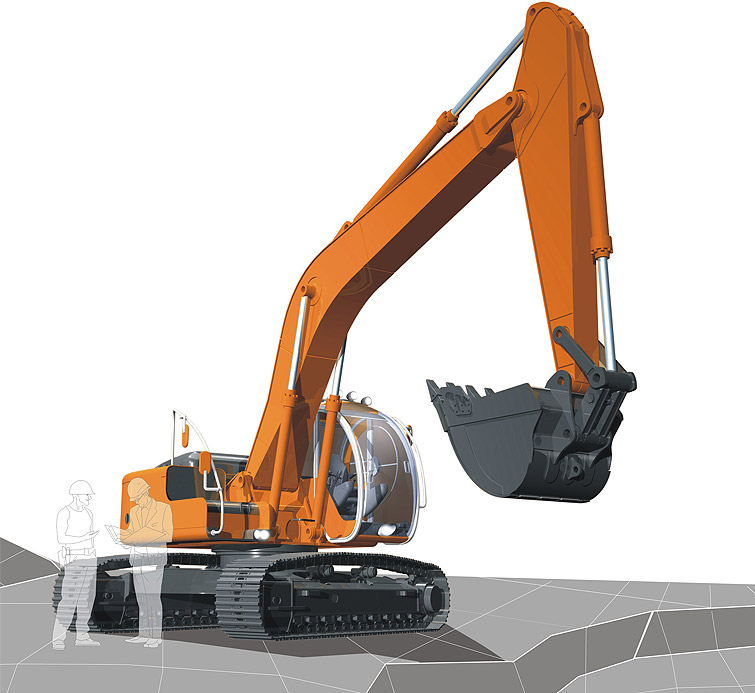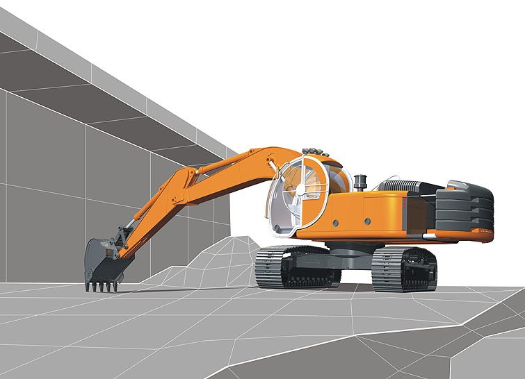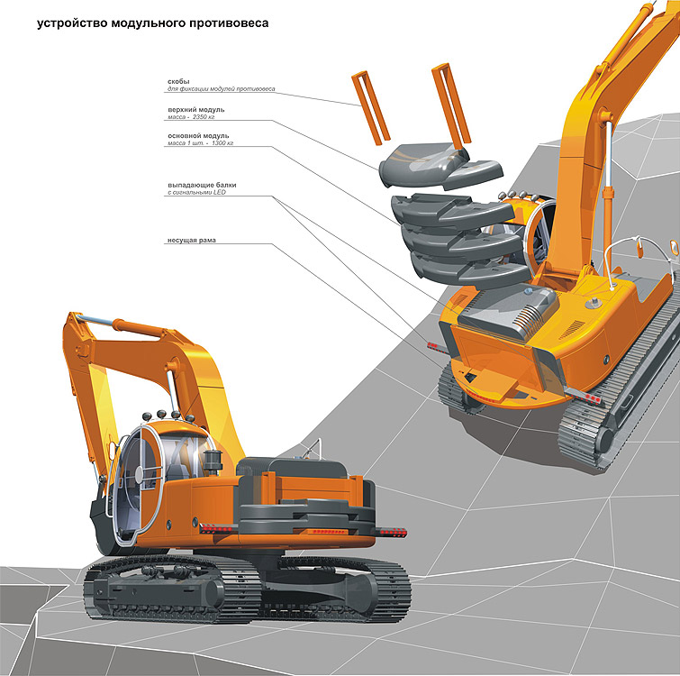 Концепция: 01 - Использование активно-плавающего противовеса. Делает экскаватор удобным как для работы в ограниченном (городская зона, лес, горы и т.п.), так и на обширном пространстве (карьеры, строительство трасс). При задвинутом противовесе экскаватор имеет высокую маневренность, удобно транспортируется (влезает в грузовик и пр. ), меньше своих аналогов занимает места на стоянке. При выдвижении противовеса удлиняется плече противовеса ковша, что увеличивает грузоподъемность (передвигать большие тяжести, пользоваться ковшами повышенной емкости, удлиненными стрелами и др.)