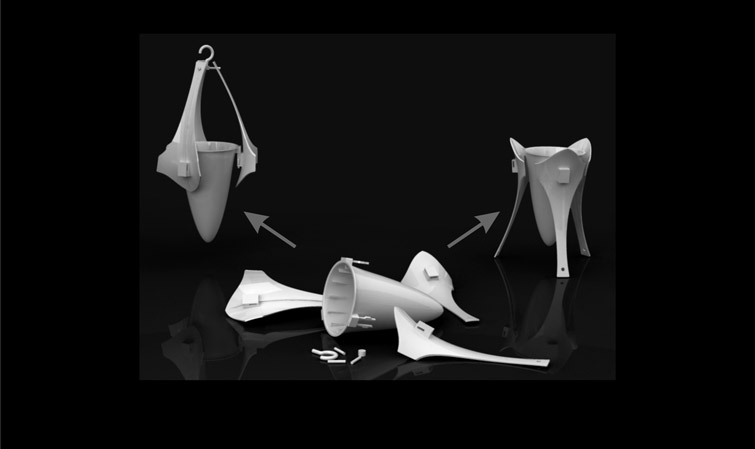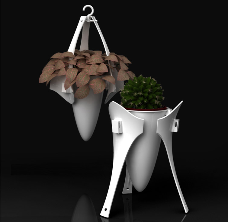 Концепция: горшочек легко меняет внешний вид и функциональность. Так как его ножки могут крепиться двумя способами к корпусу горшка. В одном положении крепления горшочек можно ставить на любую поверхность, в другом – подвешивать.