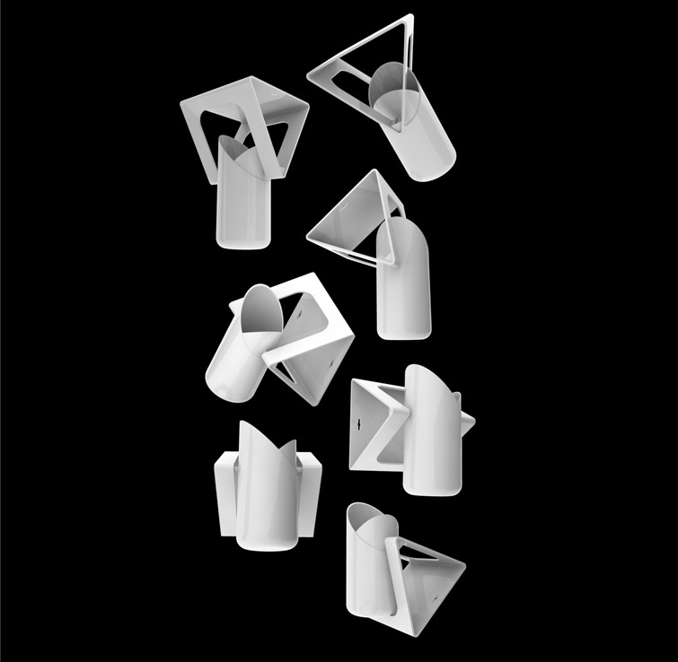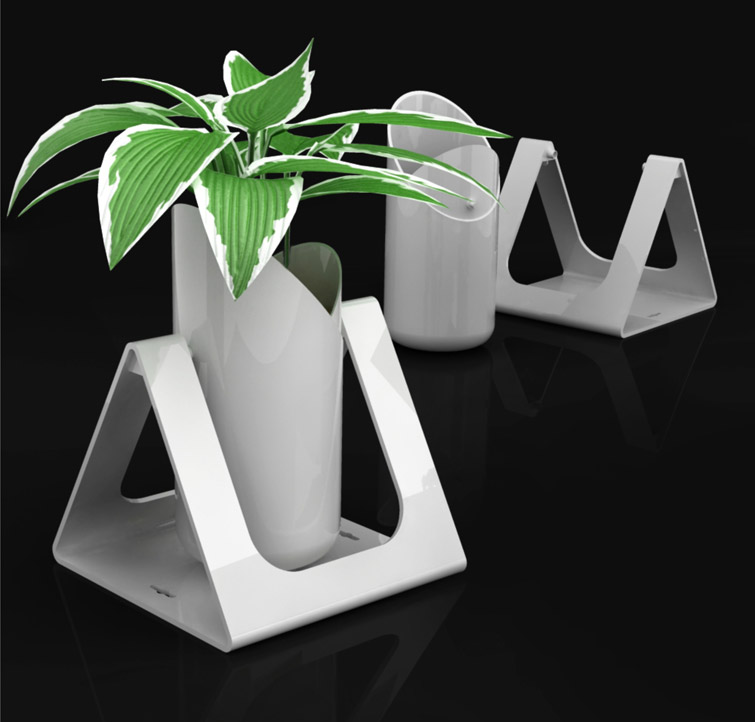 Концепция: Корпус горшочка вращается по оси относительно подставки. Таким образом горшочек может не только стоять на поверхности – но и крепиться к стене, к наклонной стене (например в мансандровых помещениях) или к потолку.