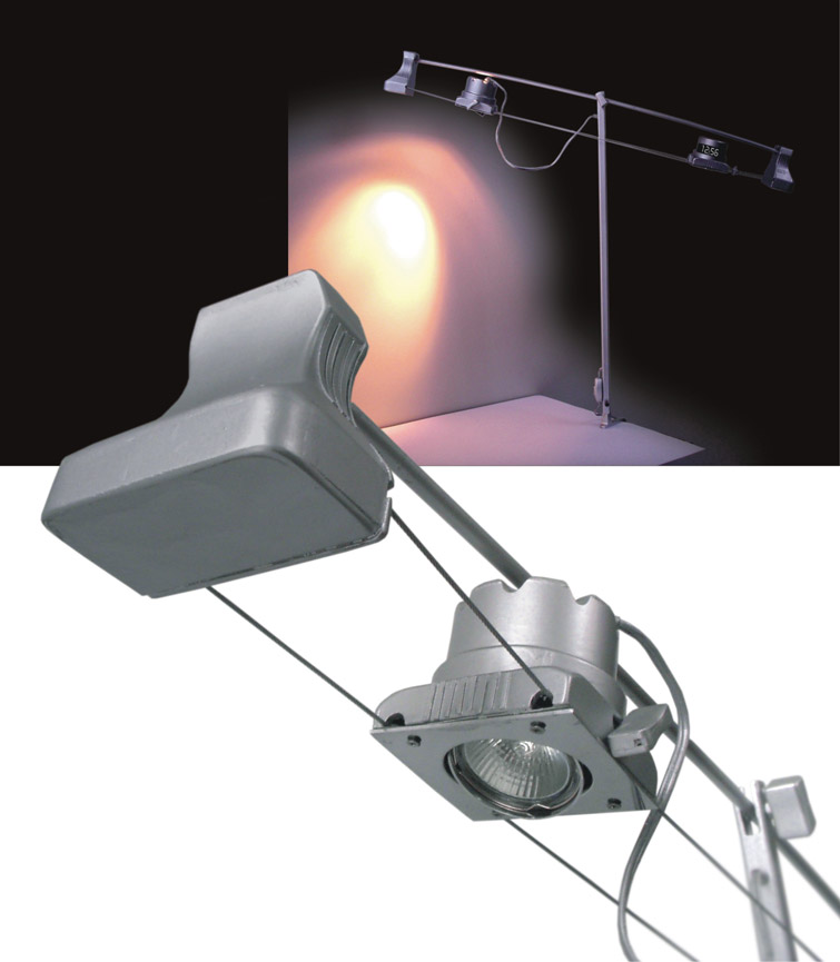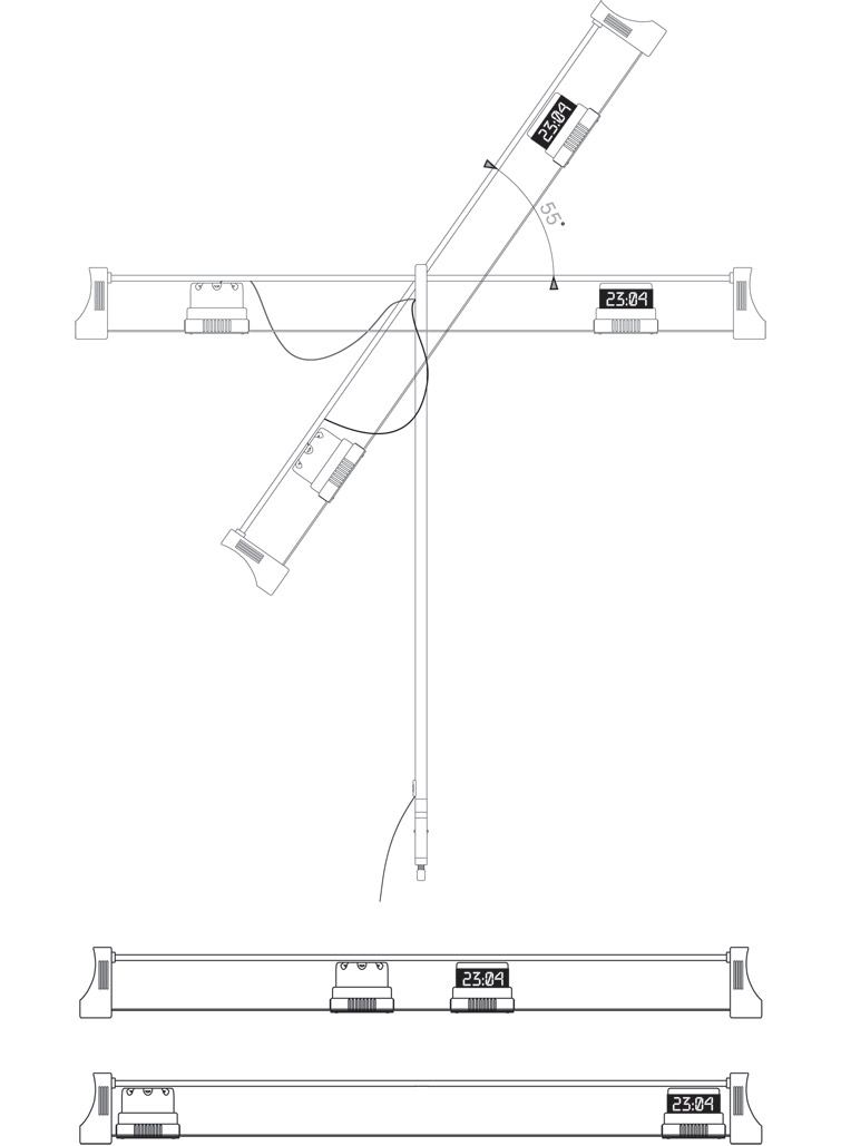 Концепция: Мобильность, вариабельность, минималистичность, технологическая простота. Конструкция светильника позволяет моделировать пользователю различные варианты освещения. Изюминка конструкции в перемещении светильника по направляющей – при передвижении часов к центральной стойке также перемещается и светильник и наоборот.