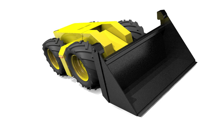 Концепция: Погрузчик управляется человеком на расстоянии. Потому он может работать в особенно опасных условиях, и в местах – где машина с кабиной для человека не могла бы проехать по причинам габаритов. Машина имеет высокую маневренность благодаря бортовому развороту. Ее силуэт имеет строгие очертания – корпус сделан из листов стали. Это недорого в производстве (по сравнению со штампованными деталями) и такой корпус легко подрихтовать в кустарных условиях. А так как машина именно потенциально создана для использования именно в опасной среде – то этот факт очень важен!