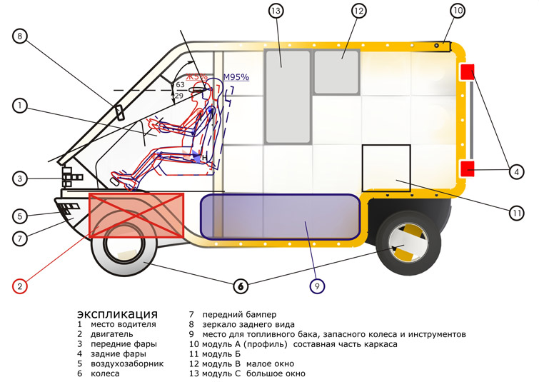 ModulCarимеет модульную систему, которая позволяет удовлетворить все запросы. На базовую модификацию авто устанавливается каркас (монтируемый из модуля A)А на каркас навешиваются навесные панели (всего их 3 типа). Окончательная сборка достаточно проста и может осуществляться в районных центрах (по индивидуальному заказу покупателя).