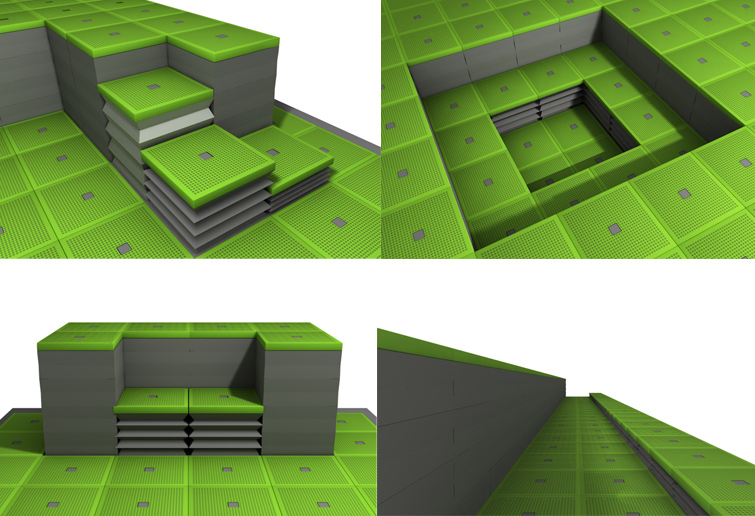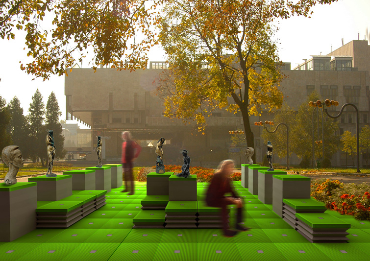 Концепция: Мы решили создать такую среду, которая могла бы быстро трансформироваться для выполнения различных функций. Напольные плиты могут подниматься и фиксироваться на различной высоте от уровня пола, тем самым изменять ландшафт поверхности. Таким образом оборудованное пространство можно быстро трансформировать в выставочный центр, подиум мод, концертную сцену, прогулочный или релаксационный парк и мн. др.