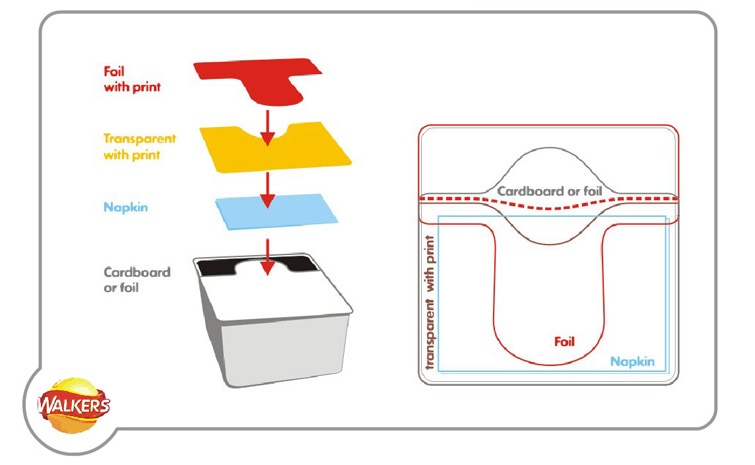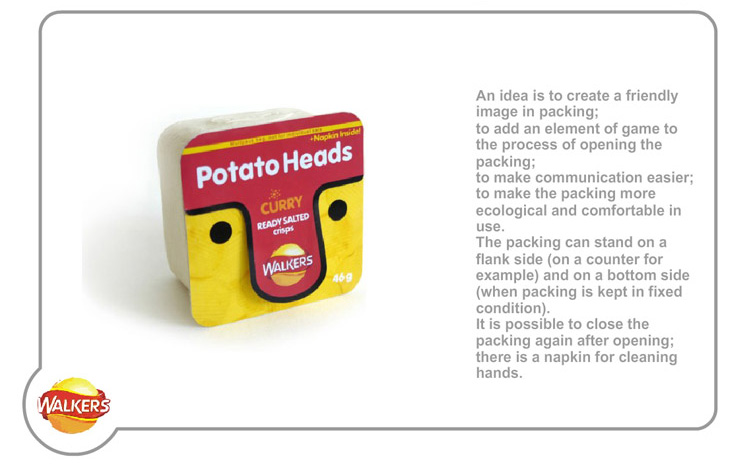 Концепция: Идея – создать дружелюбный образ в упаковке, внести элемент игры в процесс открытия, облегчить коммуникацию, сделать упаковку более экологичной и удобной в использовании. Коробка может стоять на боковой грани(на полке магазина) и на нижней грани (при использовании в стационарных условиях). Упаковку можно ставить, закрыть уже открытую, присутствует салфетка, чтобы можно было вытереть руки.