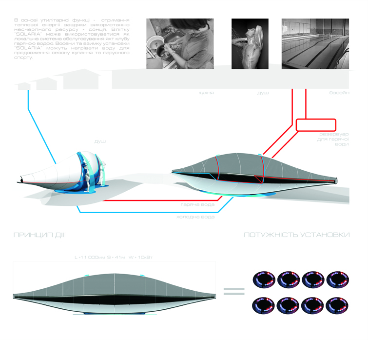 «Солярия» использует солнечную энергию для обогрева воды (используется для приготовления пищи, бассейнов, душа). Летом «Солярия» служит местной отопительной системой для «Мюхельн Марина», а осенью и зимой она нагревает воду для продления купального сезона. Система нагрева: вода по трубе попадает в абсорбер, превращается в кипяток и по трубе проводится в город.